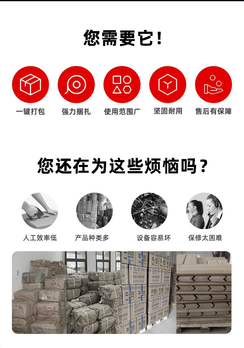 - 纸质包装:如纸箱、纸盒、纸质文件等,是自动打包机最常见的打包对象。自动打包机可以根据纸质包装的大小和重量,选择合适的打包带和打包方式,确保打包牢固,防止纸箱在搬运过程中散开。