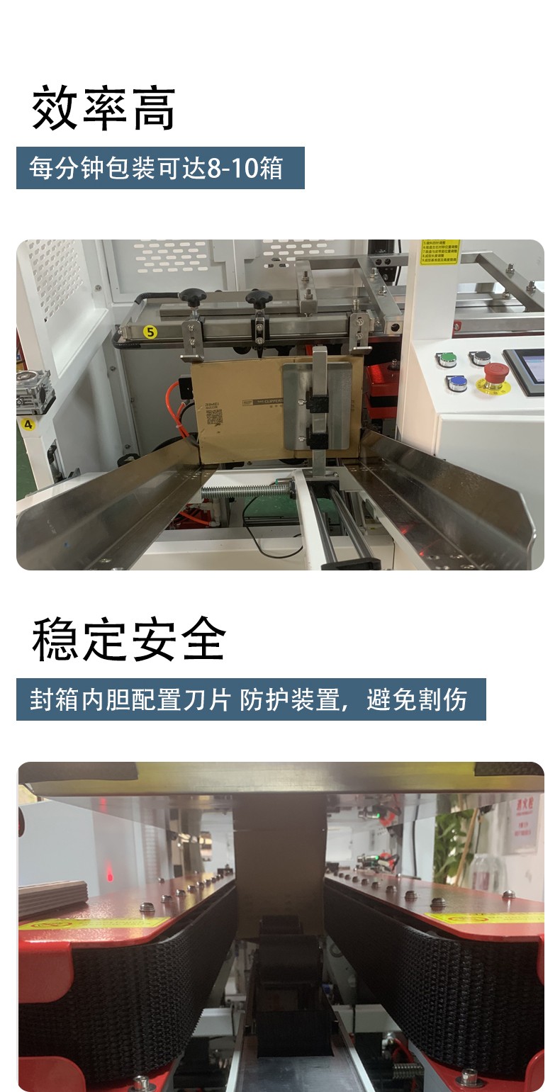 - 成品输出:封底完成后的纸箱会被输送至下一工位,进入后续的包装流程,如装箱、封箱等。操作人员只需在设备旁边观察设备的运行情况,及时处理可能出现的问题,如纸箱堵塞、胶带用完等。