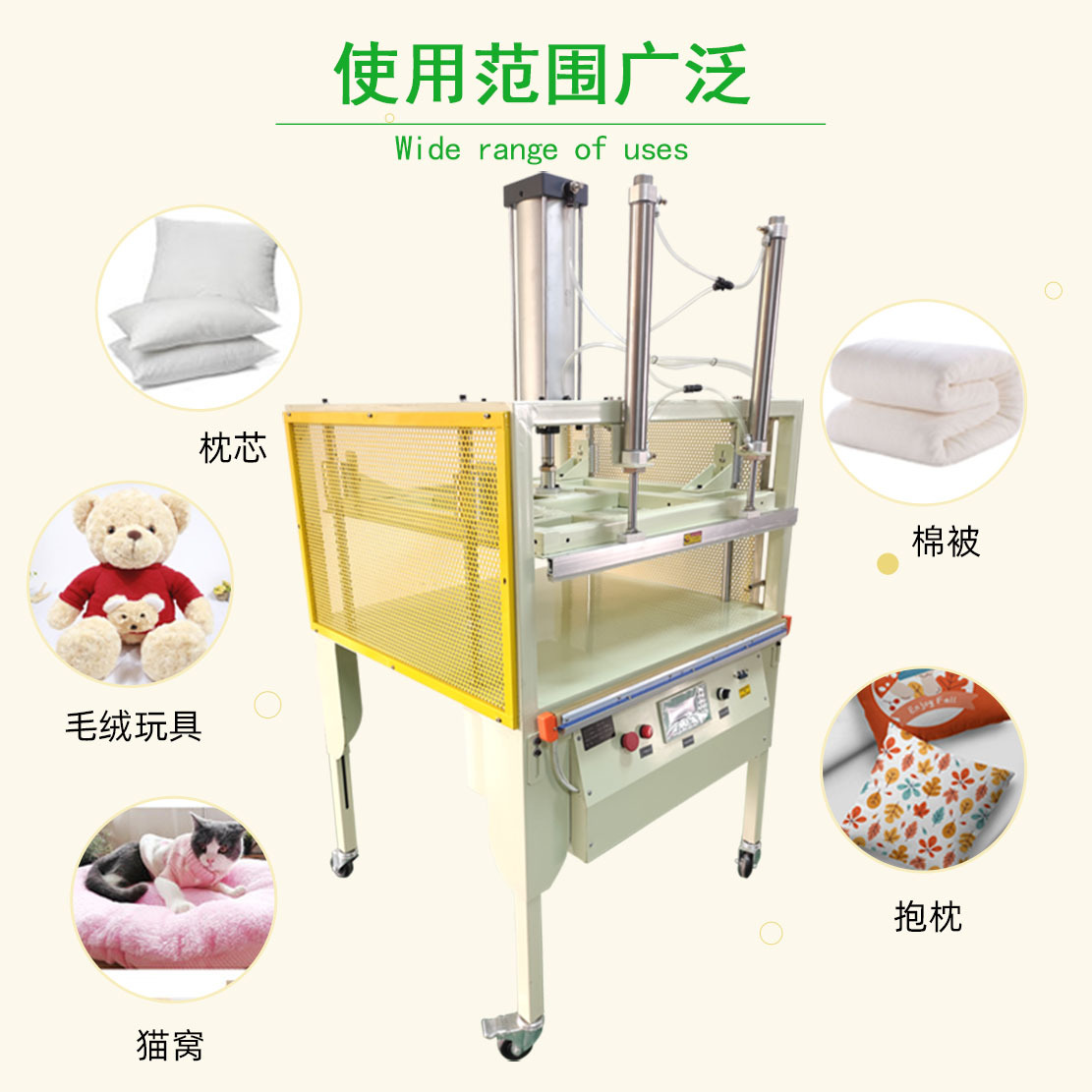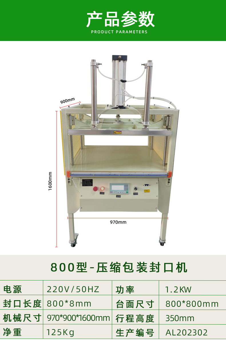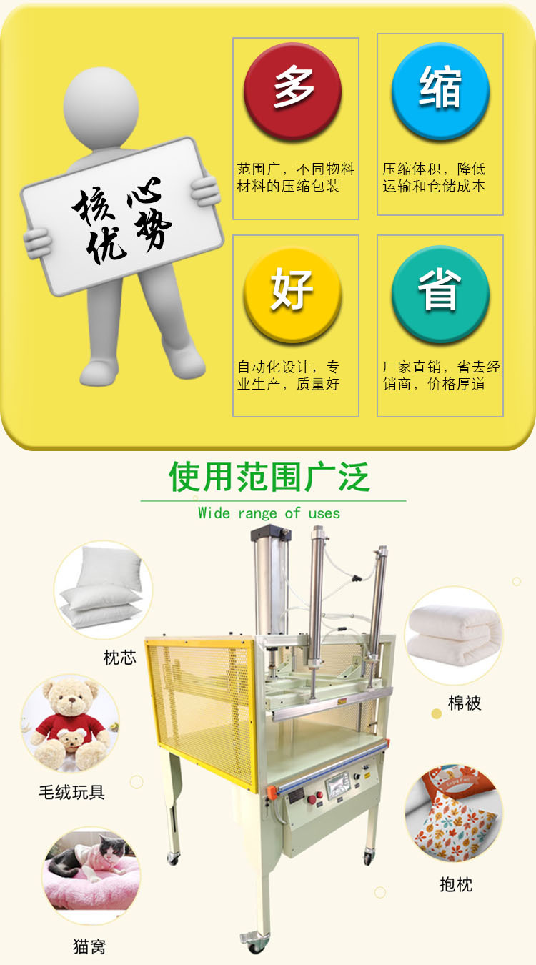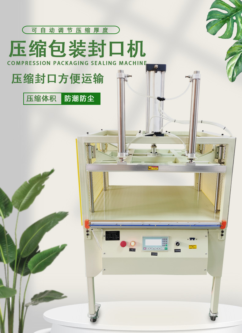 压缩包装封口机适用于压缩包装羽绒被服、太空棉被服、枕头、发泡棉、毛巾等蓬松的其它物品。可缩小包装的物品及防潮防尘