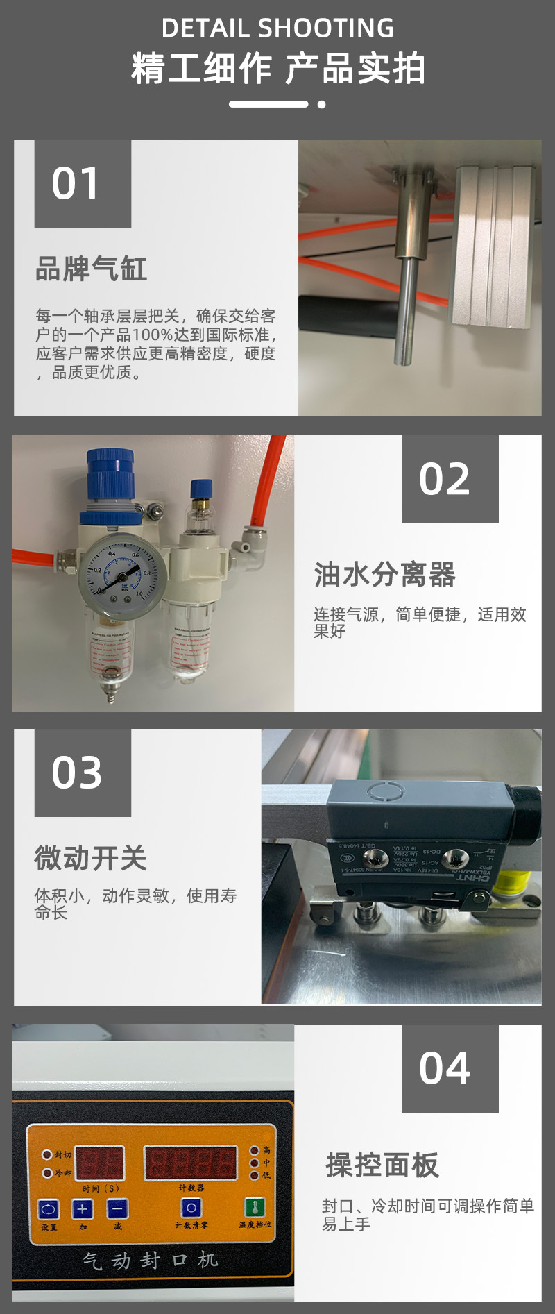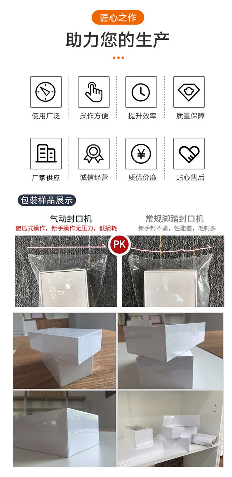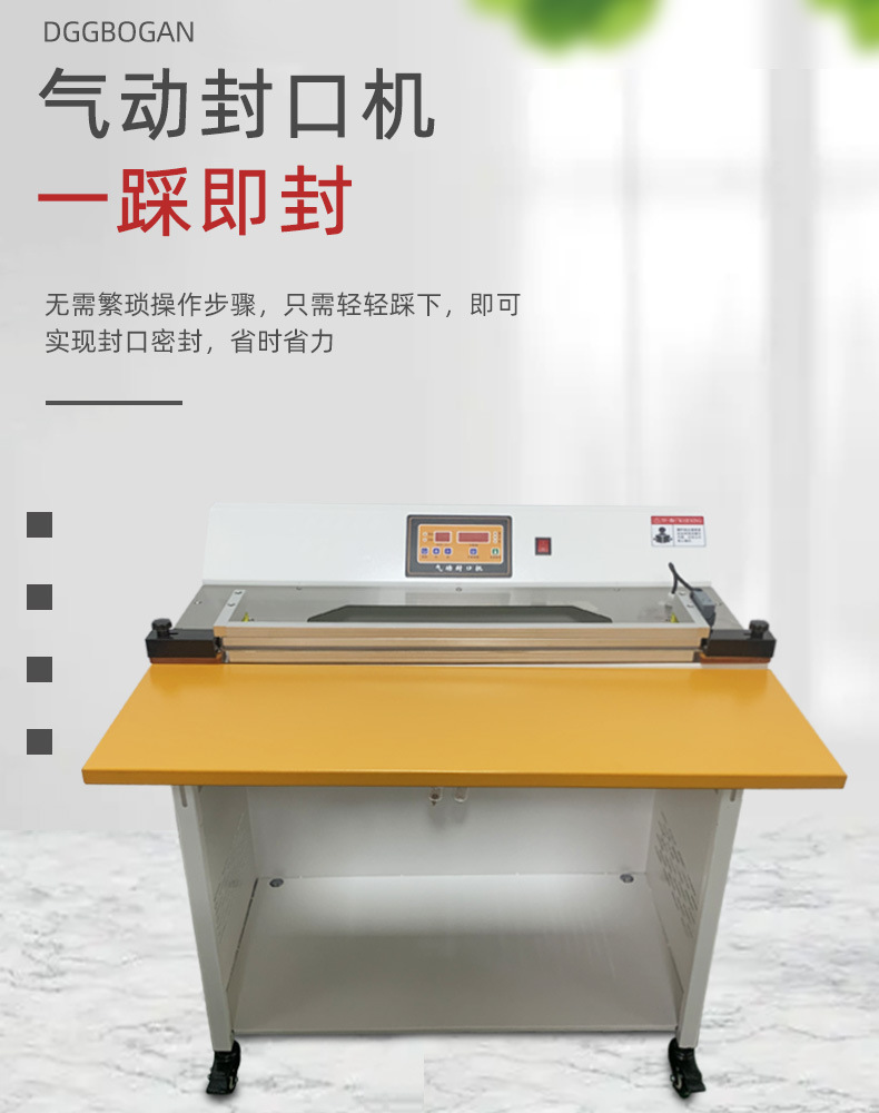 气动封口机的封口方式取决于封口头的形状和材质,常见的封口方式有平封和凸槽封。其中,平封主要用于铝箔袋的封口,凸槽封适用于各种不同的塑料袋和复合材料袋的封口。无论是哪种封口方式,气动封口机都可以通过合适的工作参数来实现封口的密封性和稳定性。