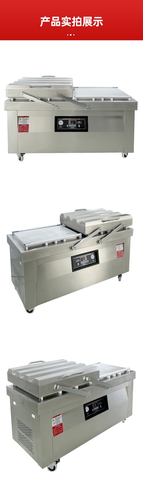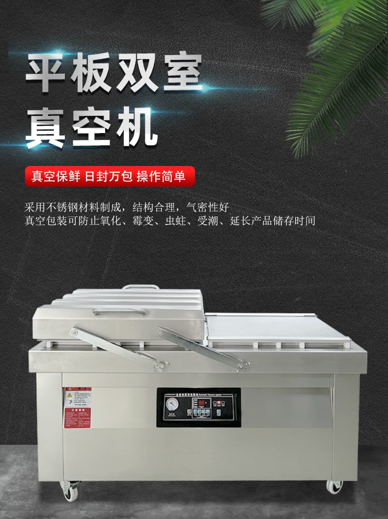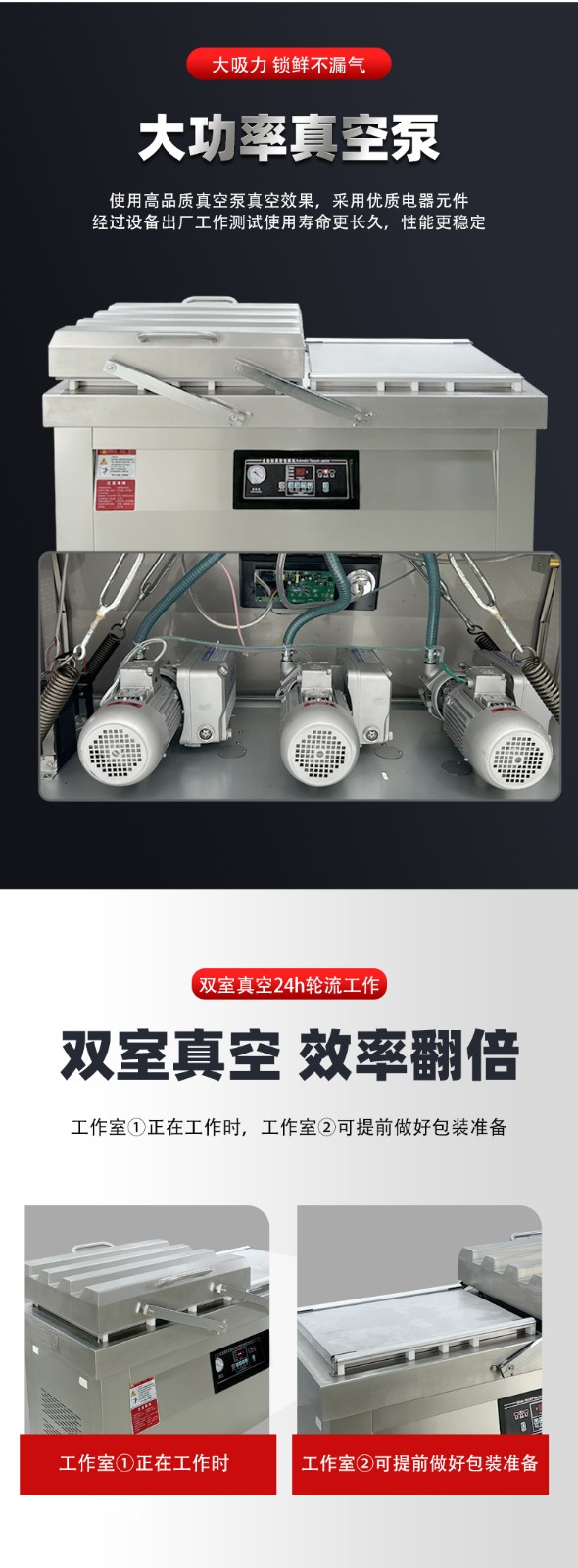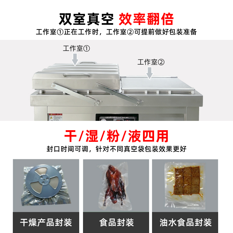 双室真空包装机通过 “双真空室轮换作业” 实现抽真空与装袋无缝衔接,核心是利用两个独立真空室的 “时间差并行操作”,让设备在同一周期内同时完成 “抽真空密封” 和 “人工 / 自动装袋”,彻底消除单室机型 “抽真空时无法装袋” 的等待间隙,大幅提升作业效率。其具体运作逻辑和优势可拆解为以下 3 点: