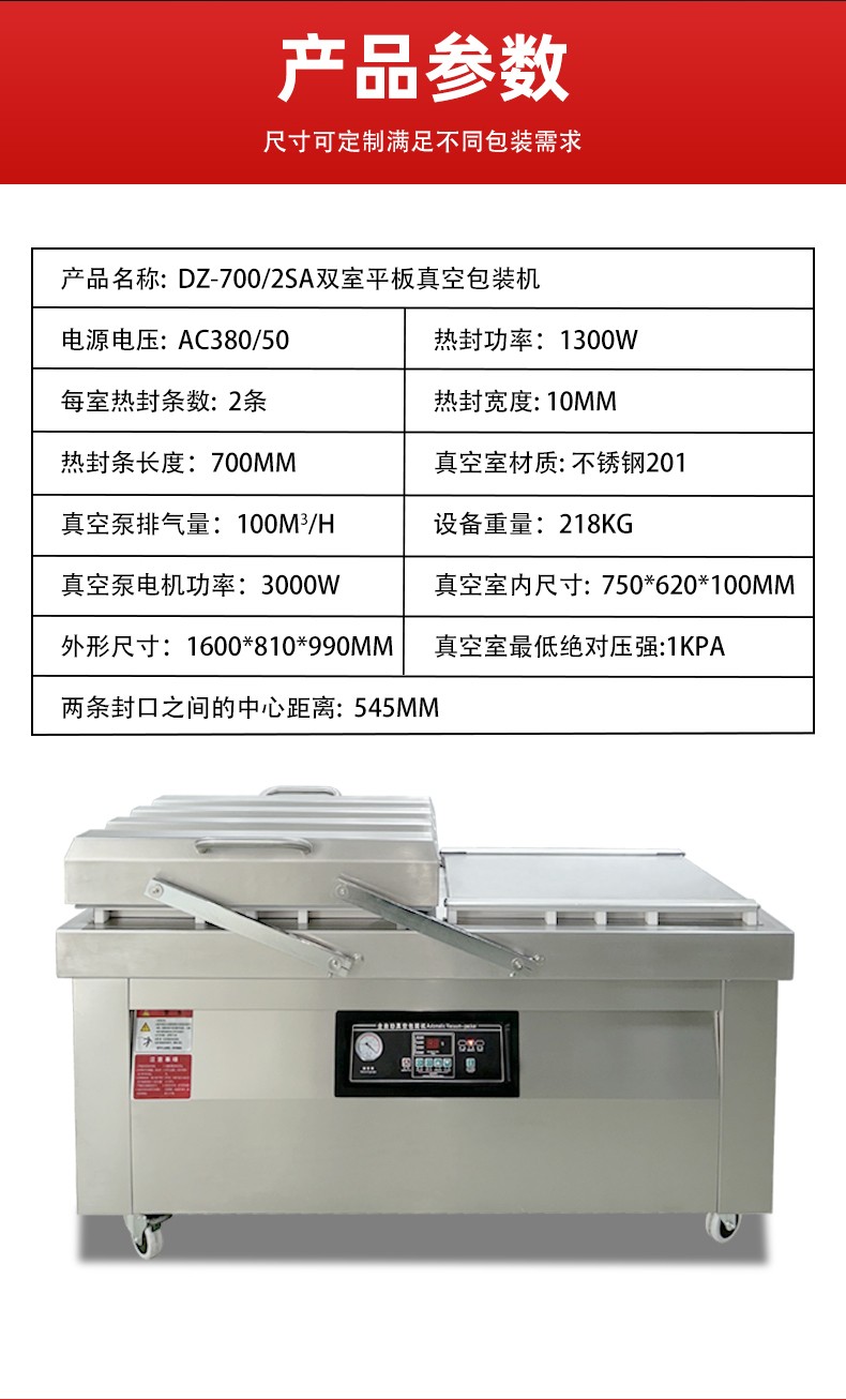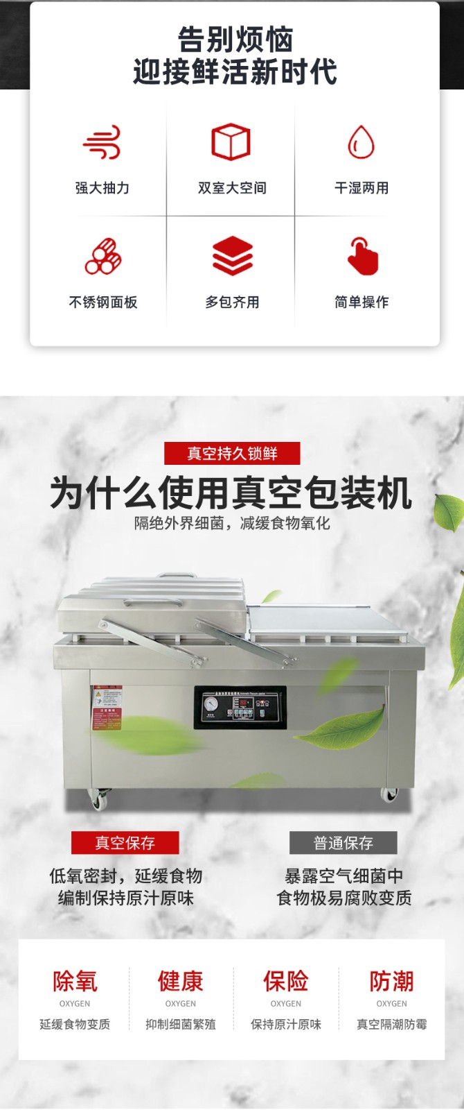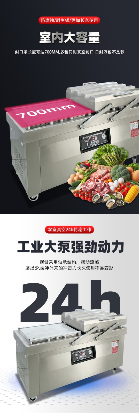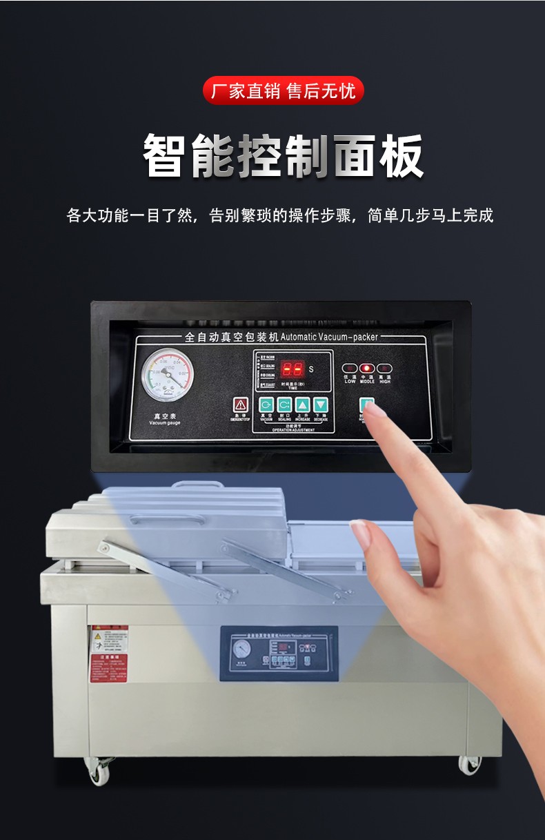 双室真空包装机通过 “双真空室轮换作业” 实现抽真空与装袋无缝衔接,核心是利用两个独立真空室的 “时间差并行操作”,让设备在同一周期内同时完成 “抽真空密封” 和 “人工 / 自动装袋”,彻底消除单室机型 “抽真空时无法装袋” 的等待间隙,大幅提升作业效率。其具体运作逻辑和优势可拆解为以下 3 点: