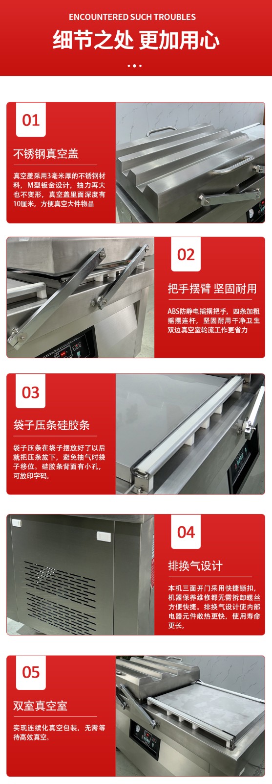 - 同一时间,右室真空盖保持开启,操作人员可同步将下一批待包装产品放入右室包装袋并摆好(即 “装袋准备”),无需等待左室流程结束 —— 此时左室 “忙” 于抽真空密封,右室 “闲” 于装袋,两者并行不冲突。