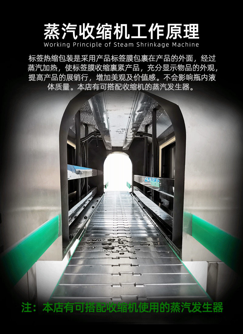 蒸汽收缩机是新一代收缩膜机,设计精巧, 外型美观,不占空间,移动,安装迅速快捷,超大范围的调节,使其可适用于各种输送带和滑道。